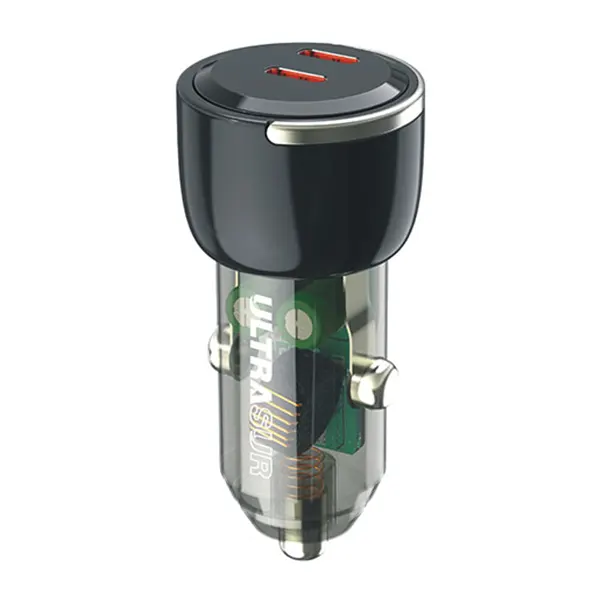 The ULTRASUR Car Charger Model U-B3 is designed with a durable metal body combined with transparent glass, giving it both strength and elegance. It supports an input voltage range of 12V-24V and delivers a total output power of 60W. Equipped with two PD ports and no USB port, this charger is capable of charging two devices simultaneously with super-fast charging technology. The U-B3 ensures stable performance without amp drop or overheating, making it a high-quality and reliable choice for modern drivers.